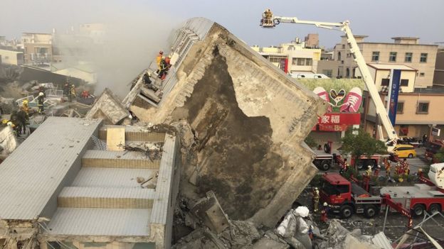 The 17 storeys of the Weiguan Jinlong (Golden Dragon) apartment complex crumpled as the quake struck just before 04:00 local time on Saturday (20:00 GMT Friday), as Taiwan was beginning the lunar new year holiday